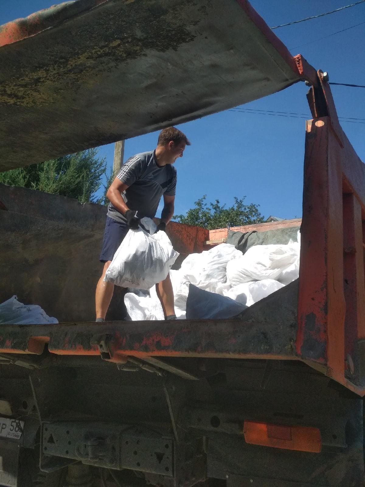 Вывоз кирпичей на КамАЗе с погрузкой мусора в мешках.
